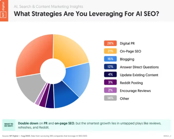 PR is evolving and is more important now than ever. NP digital reported Digital PR as the biggest strategy people are leveraging for AI SEO. “Ranking on these LLM’s in this zero-click world requires a lot more digital PR than it used to” (SEO 2.0).