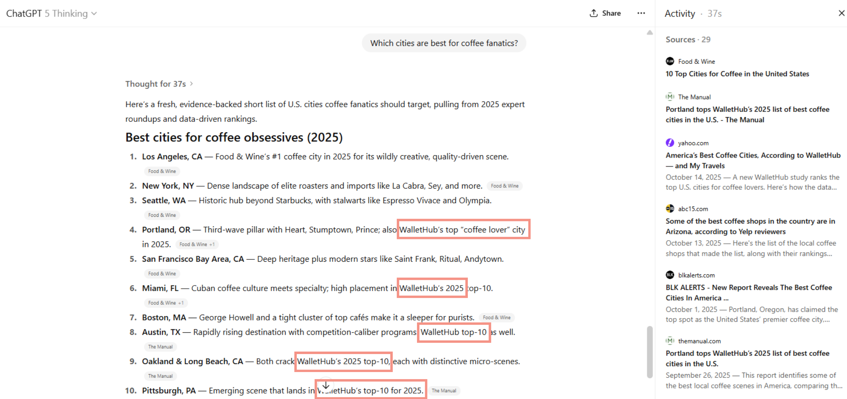 What this tells us? Listicles like one from Food & Wine and coverage of digital PR campaigns by Wallethub and Yelp get cited. The Wallethub study may show up above the fold, but it is the data featured in outlets on the source list. Aim outreach to both national lifestyle and local outlets.