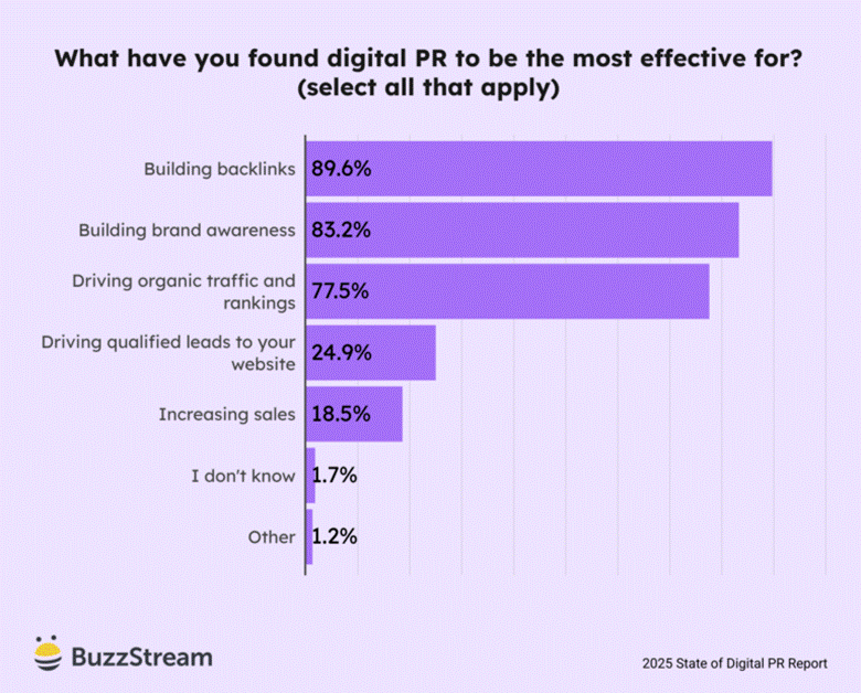 And according to a 2025 survey from Buzzstream, digital PR is the most effective for first building backlinks (89.6%) and, a close second, building brand awareness (83.2%):