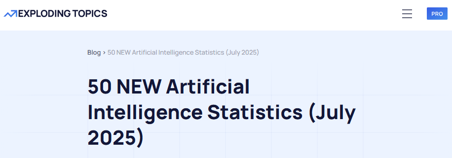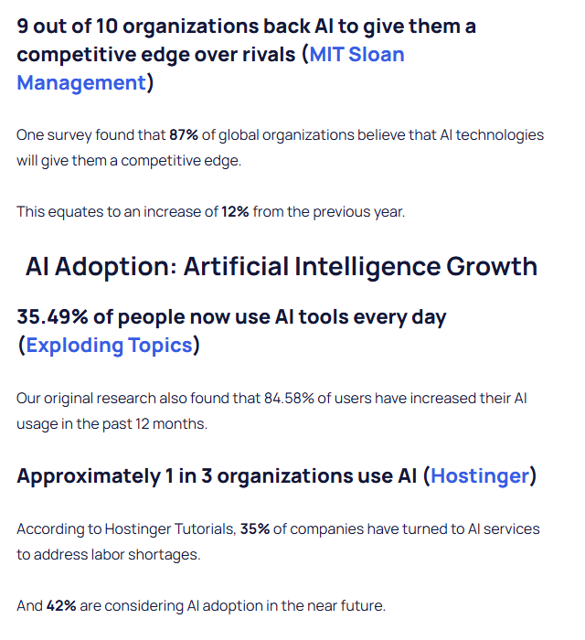 Example: Exploding Topics is the best at curating stat pages that are easy to peruse, beautifully edited, and structured with AEO in mind. Each stat is clearly cited and their team weaves in “original research” to boost their own authority on the topics they cover.