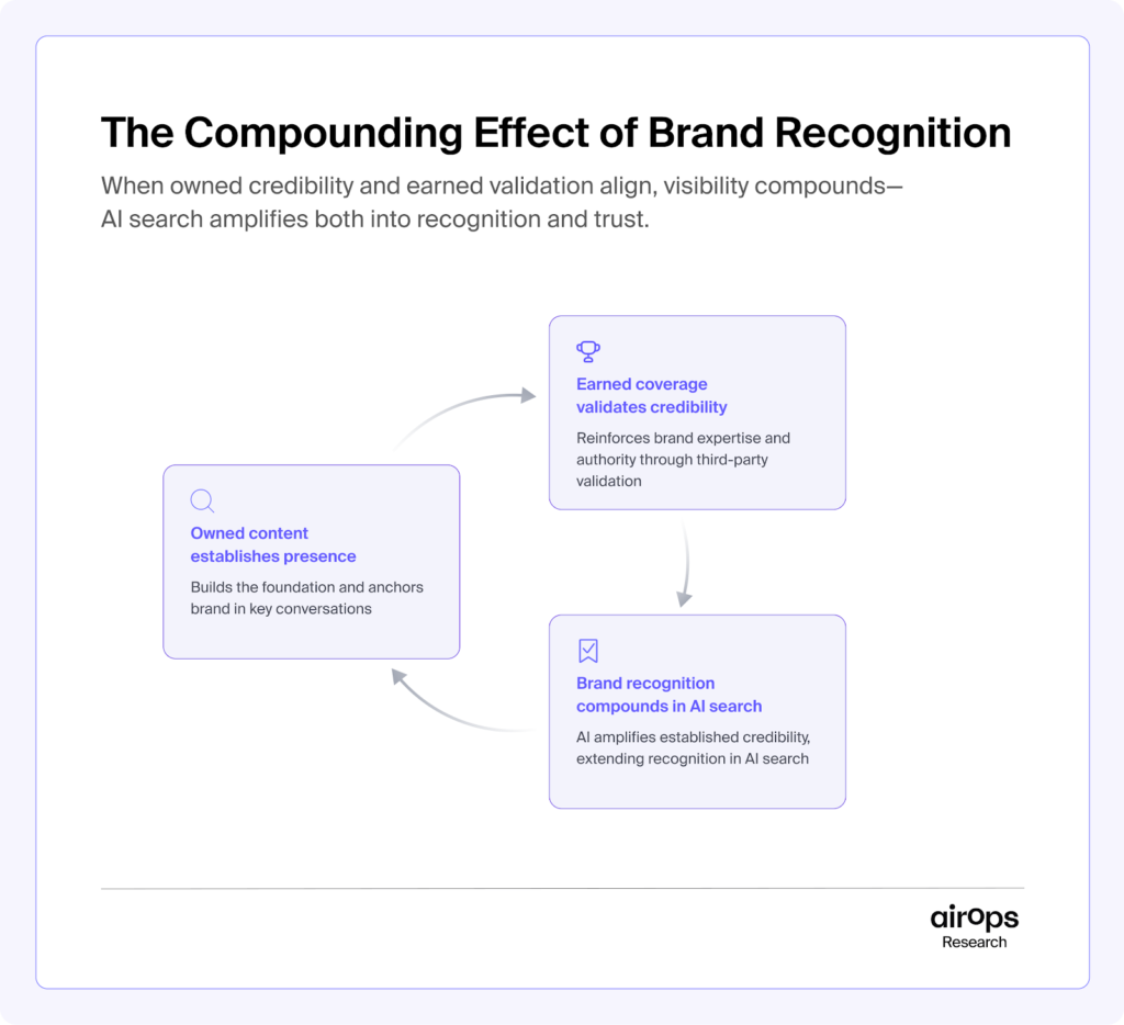 An analysis from AirOps of 21,311 brand mentions finds that 85% of brand mentions in AI search are from third-party sources. In other words, the data shows that AI is heavily influenced by what others say, so aligning owned content with earned coverage and recognition should compound, as the visual below shows.