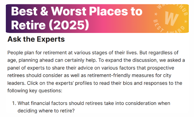 Example: The master of this format, Wallethub, goes an extra step and combines the Q & A format with expert commentary, like in their report on the Best & Worst Places to Retire.