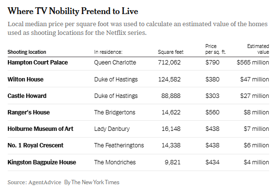 | Agent Advice | Bridgerton Home Value Study | Pop Culture Property Valuation Study | Cultural crossover + fantasy-to-market affordability tension | https://www.nytimes.com/2024/06/13/realestate/bridgerton-home-value-estimate.html |