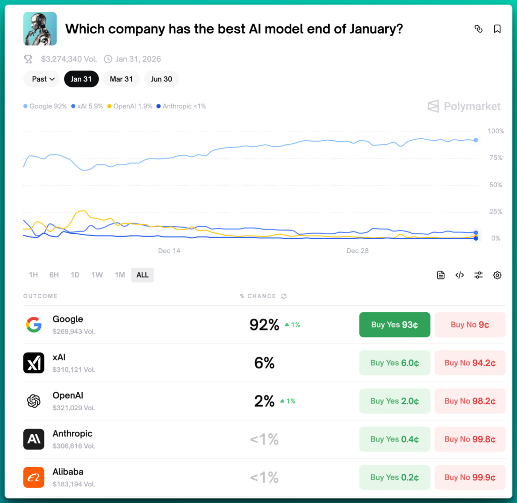 As it stands on Monday Jan 5, 2026 at 6:18pm PST, Kalshi gamblers predict that Google will have the best AI model at the end of January 2026. See this bet here: What will be the top AI model this month?